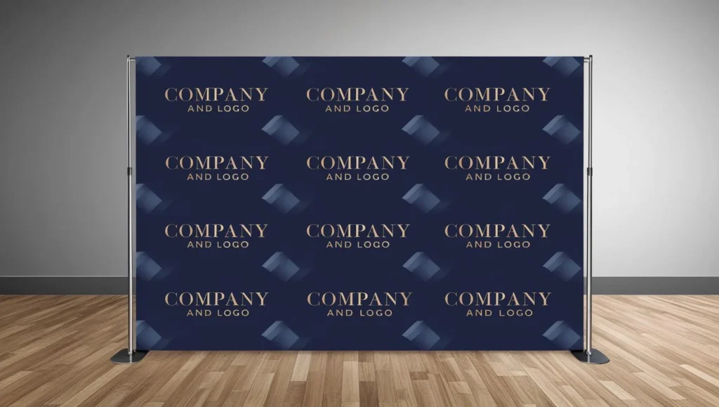 A step and repeat backdrop is a large printed display featuring repeated logos, brand names, or event sponsors. It is commonly used as a background for photography, helping increase brand exposure in every captured image.